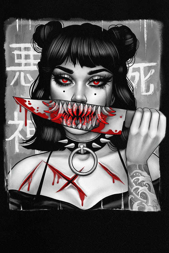 Oversize hoodie. Tasarım, korku ve manga sanatından ilham almıştır. Yüzünün önünde, özellikle de ağzının önünde bıçak tutan (hoş) bir kızın portresini gösteriyor. Sevimli bir gülümseme yerine kötü bir canavarın acımasız sırıtışının yansımasını görebiliriz.